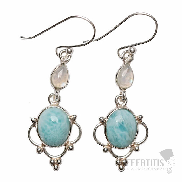 Attractive silver designer earrings with larimar and moonstone . Ag 925. The weight listed is for the entire pair. You are purchasing the exact piece of jewelry shown. Larimar, also known as the "dolphin stone", is one… more »