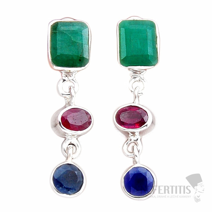 Elegant and distinctive silver earrings with cut Indian emerald, ruby and sapphire. Ag 925. The earrings have a stud fastening. Indian emerald is a trade name for a natural stone, most often sillimanite or corundum, artificially dyed to the color of emerald. It is therefore not a natural emerald. The weight stated is for the entire pair. You are purchasing the pair pictured.