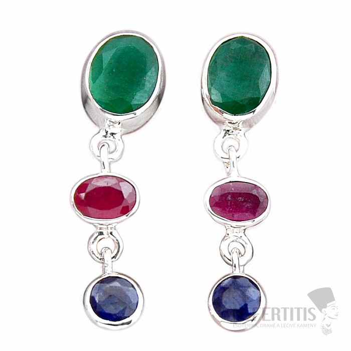 Elegant and distinctive silver earrings with cut Indian emerald, ruby and sapphire. Ag 925. The earrings have a stud fastening. Indian emerald is a trade name for a natural stone, most often sillimanite or corundum, artificially dyed to the color of emerald. It is therefore not a natural emerald. The weight stated is for the entire pair. You are purchasing the pair pictured.