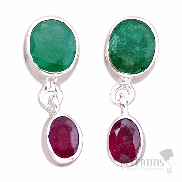 Elegant and distinctive silver earrings with a cut Indian emerald and a cut Indian ruby. Ag 925. The earrings have a stud fastening. Indian emerald is a trade name for a natural stone, most often sillimanite or corundum, artificially dyed to the color of emerald. It is therefore not a natural emerald. The weight stated is for the entire pair. You are purchasing the pair pictured.
