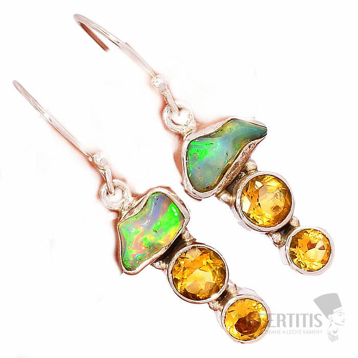 Charming silver earrings with raw, polished opals, with a beautiful play of colors, and cut citrines. Ag 925. Impressive and elegant jewelry, evoking joy and feelings of harmony from the look. Ethiopian opals, compared… more »