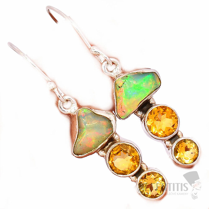 Charming silver earrings with raw, polished opals, with a beautiful play of colors, and cut citrines. Ag 925. Impressive and elegant jewelry, evoking joy and feelings of harmony from the look. Ethiopian opals, compared… more »