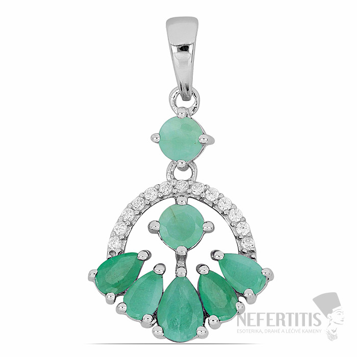 Exclusive silver pendant from the Nefertitis design line with cut natural emeralds. The emeralds are complemented by cubic zircons for an unmistakable shimmering look. The stones are set in rhodium-plated silver, the surface of which resembles the appearance of white gold, so the pendant creates a luxurious impression. Rhodium-plated silver is less prone to surface oxidation (blackening). A beautiful glittering piece of jewelry with a clear stone of jewelery quality, the beauty of which is emphasized by the impact of light on the individual cut surfaces, suitable for various occasions. Rhodium plated silver Ag 925/1000, emeralds approx. 1.53 carats. The box shown is not included. We deliver jewelry in a standard paper gift box. Illustrative illustration.