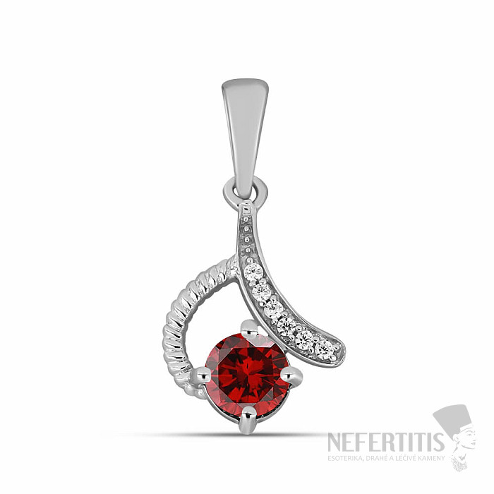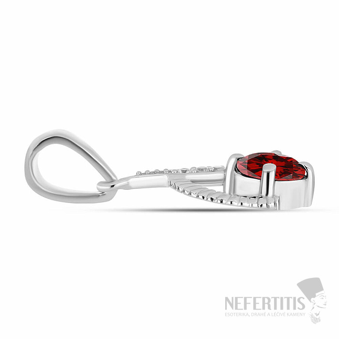 Exclusive silver pendant from the Nefertitis design line with a cut garnet. The garnet is complemented by cubic zirconia for an unmistakable sparkling look. The stones are set in rhodium-plated silver , the surface of which resembles the appearance of white gold, giving the pendant a luxurious impression. Rhodium-plated silver is less susceptible to oxidation (blackening) of the surface. Beautiful sparkling jewelry with a clear gem-quality stone, the beauty of which is emphasized by the impact of light on the individual facets of the cut, suitable for various occasions. Rhodium-plated silver Ag 925/1000. Garnet size 5 mm. Illustrative image.