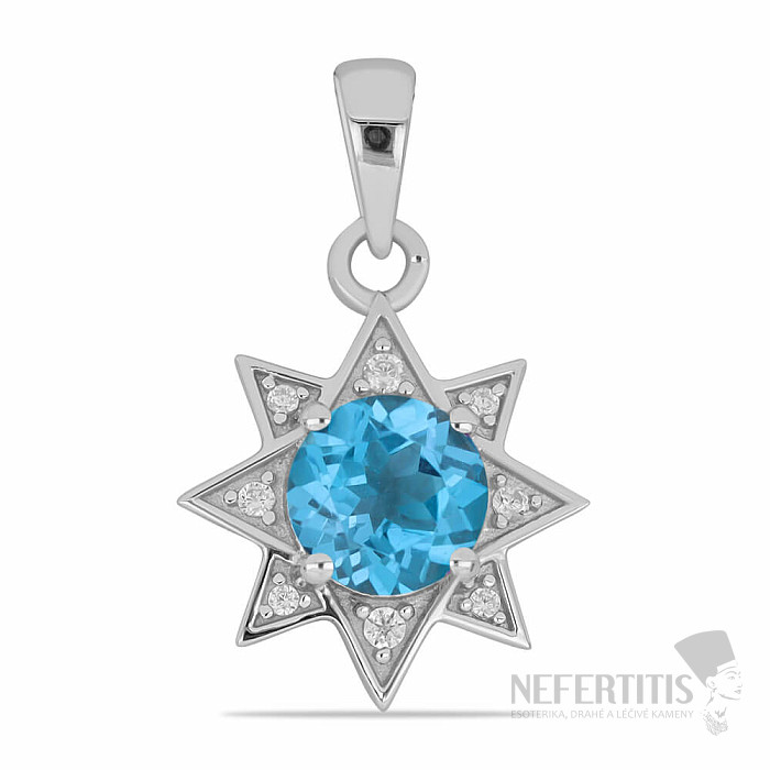 Exclusive silver pendant from the Nefertitis Collection design line with cut Swiss Blue topaz. Topaz is complemented by cubic zirconias for an unmistakable sparkling look. The stones are set in rhodium-plated silver , the surface of which resembles the appearance of white gold, giving the pendant a luxurious impression. Rhodium-plated silver is less prone to oxidation (blackening) of the surface. A beautiful sparkling jewel with a clear stone of jeweller's quality, the beauty of which is emphasized by the impact of light on the individual surfaces of the cut, suitable for various occasions. We deliver the jewelry in a standard paper gift box. Illustrative image.
