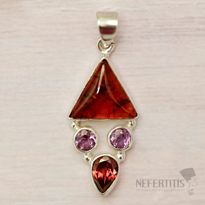Silver pendant with beautiful honey-colored Baltic amber, cut amethysts and cut garnet. Ag 925. A striking and truly eye-catching pendant. You are purchasing the exact piece of jewelry pictured.