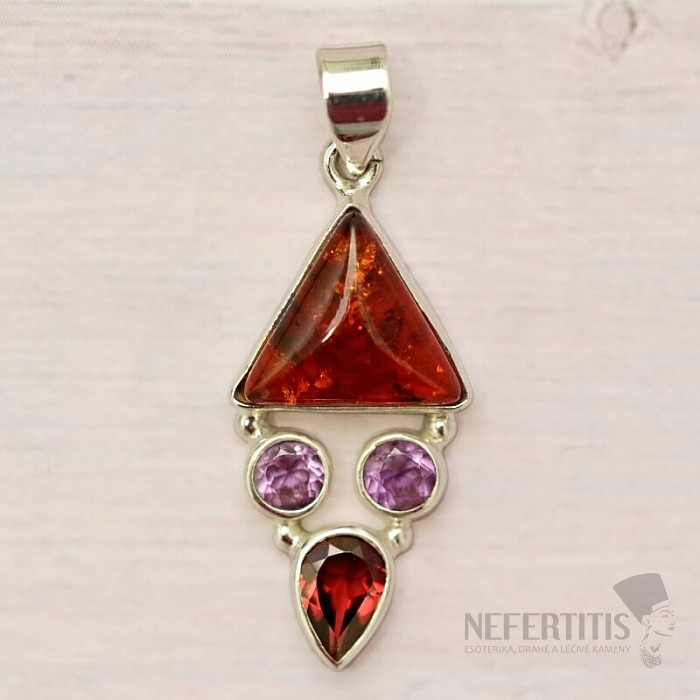 Silver pendant with beautiful honey-colored Baltic amber, cut amethysts and cut garnet. Ag 925. A striking and truly eye-catching pendant. You are purchasing the exact piece of jewelry pictured.