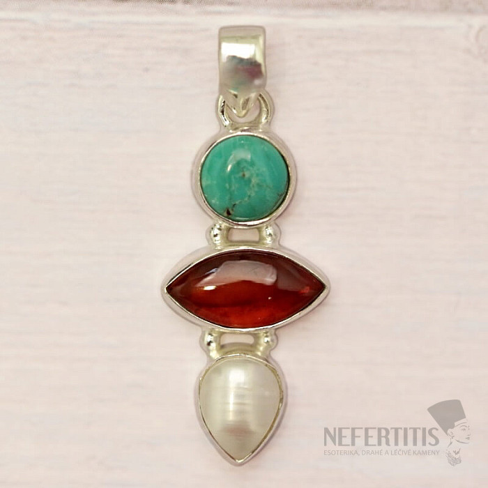 Silver pendant with beautiful honey-colored Baltic amber, turquoise and pearl. Ag 925. A distinctive and truly eye-catching pendant. You are purchasing the exact piece of jewelry pictured.