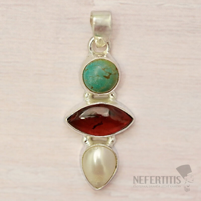 Silver pendant with beautiful honey-colored Baltic amber, turquoise and pearl. Ag 925. A distinctive and truly eye-catching pendant. You are purchasing the exact piece of jewelry pictured.