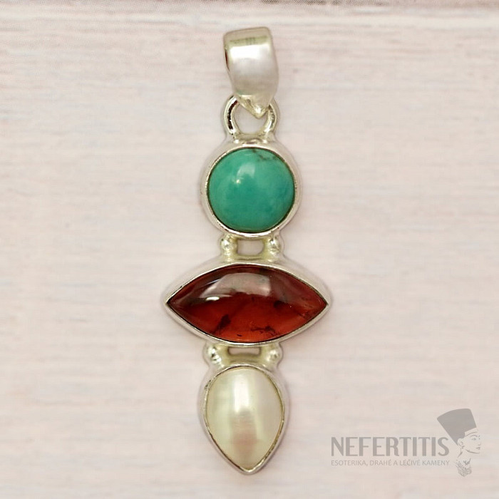 Silver pendant with beautiful honey-colored Baltic amber, turquoise and pearl. Ag 925. A distinctive and truly eye-catching pendant. You are purchasing the exact piece of jewelry pictured.