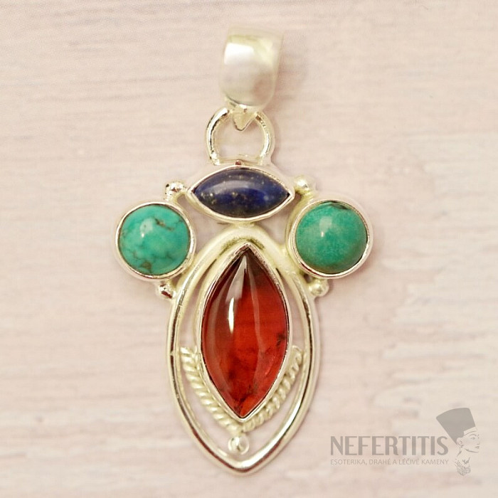 Silver pendant with beautiful honey-colored Baltic amber, turquoise and Lapis Lazuli. Ag 925. A distinctive and truly eye-catching pendant. You are purchasing the exact piece of jewelry pictured.