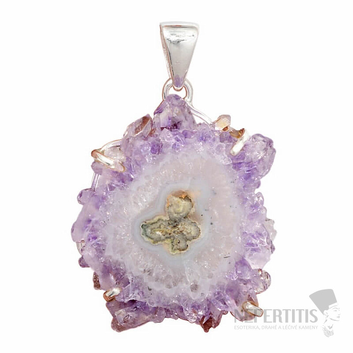 Exclusive, charming silver pendant from the polished center of a rare amethyst stalactite - a stalactite, formed deep in the cave over millions of years, the formation of which is initiated by the first drop of mineral water. Ag 925. The double-sided polished slices of amethyst stalactite are associated with inner growth, new beginnings and support of the higher "Self". Their unusual appearance, reminiscent of the petals of delicate purple asters, makes this jewelry very beautiful. You are purchasing the jewelry pictured directly.