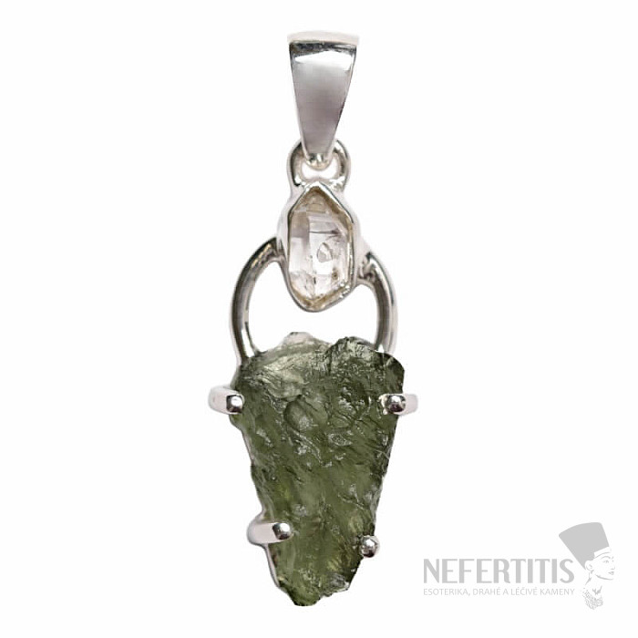 Beautiful designer silver pendant with moldavite and Herkimer diamond. Ag 925. Moldavite is considered a lucky charm. You are purchasing the exact piece of jewelry pictured.