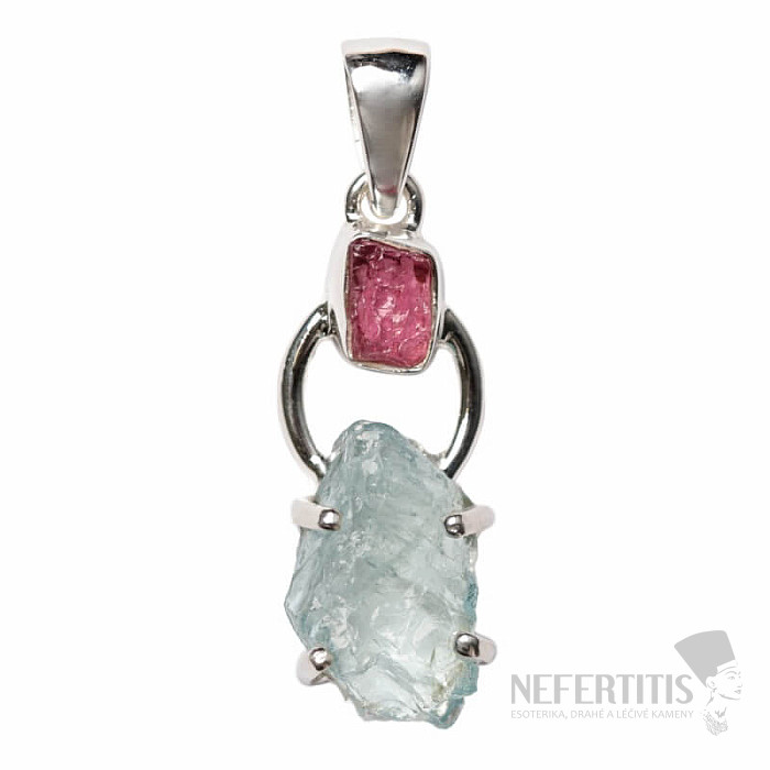Beautiful designer silver pendant with raw aquamarine and pink tourmaline. Ag 925. You are purchasing the jewelry pictured. Aquamarine is a symbol of peace, joy and happiness, especially in relationships. According to… more »