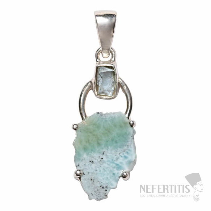 Beautiful designer silver pendant with a slice of larimar and raw aquamarine. Ag 925. You are purchasing the jewelry pictured. Larimar, also known as the "dolphin stone", is one of the rarest semi-precious stones in… more »
