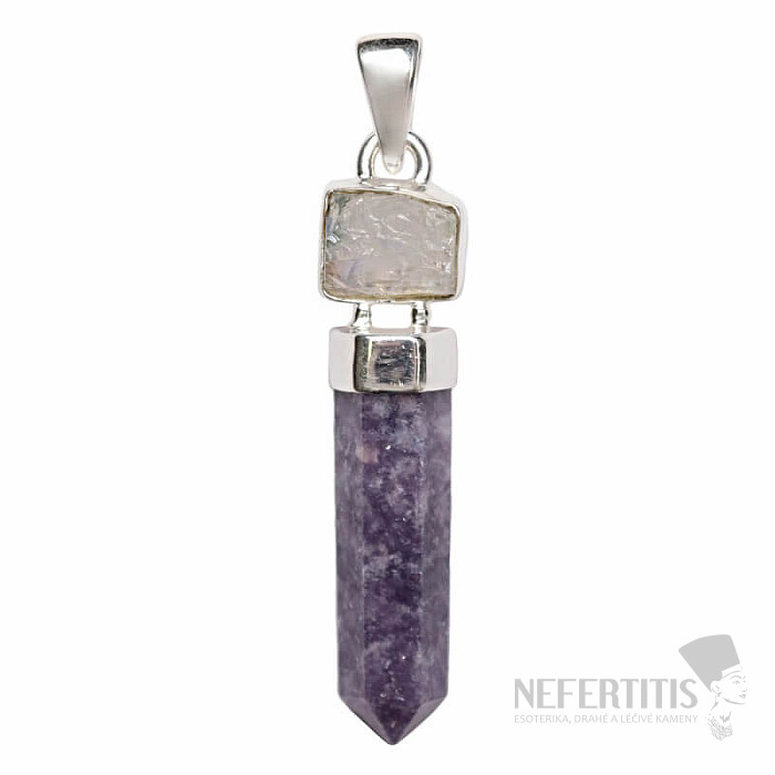 Beautiful designer silver pendant with lepidolite crystal and raw moonstone. Ag 925. You are purchasing the jewelry pictured directly.