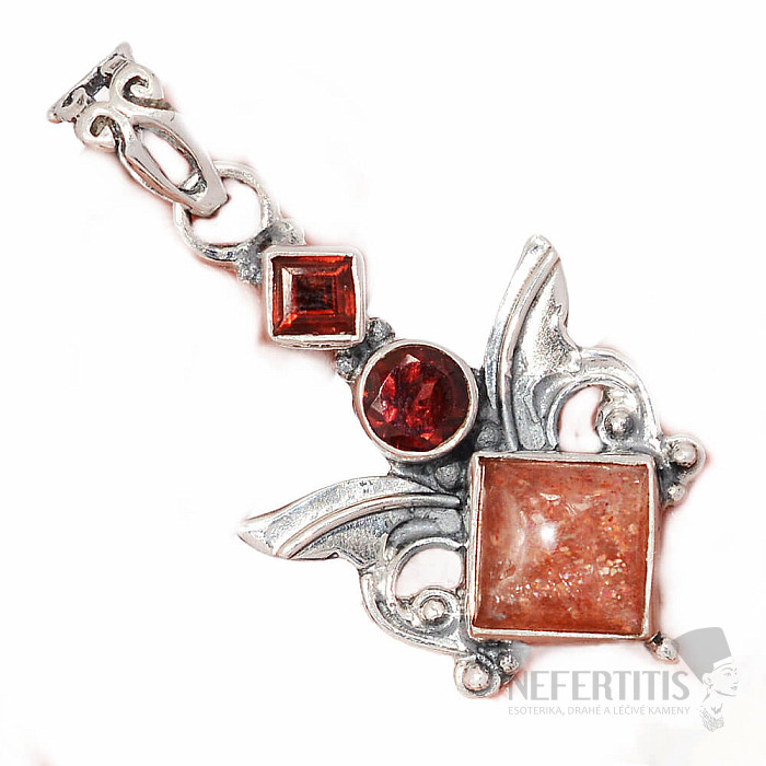 Beautiful designer silver pendant with sunstone and cut garnets. Ag 925. The beautiful orange color of sunstone will bring joy to life, it is a symbol of friendship, pleasure and family togetherness. You are purchasing… more »