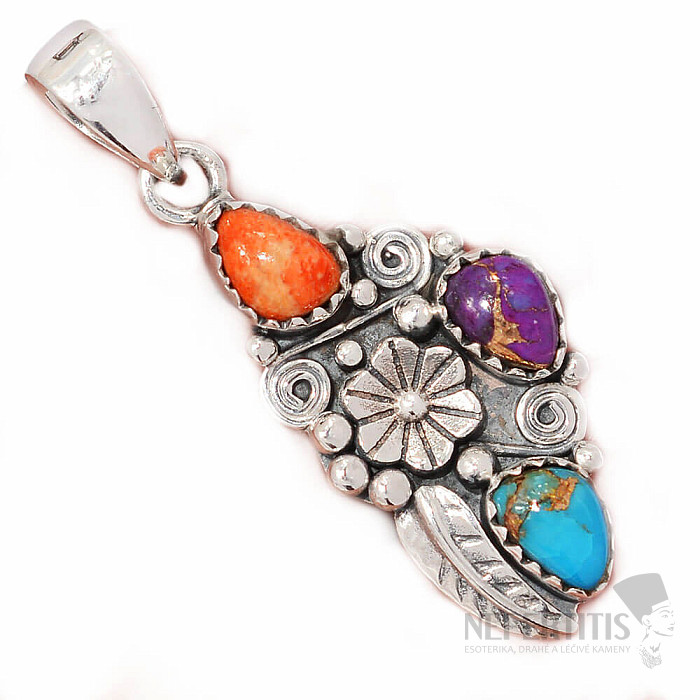 Beautiful designer silver pendant with pieces of natural, dyed turquoise , connected with copper into impressive cabochons of beautiful purple blue and orange colors. This type of jewelry is gaining great popularity in the world due to the ever-increasing price of solid pieces of natural turquoise. Cabochons created in this way are one of the few options today to buy jewelry with natural turquoise at a relatively affordable price. Ag 925. You are buying the jewelry shown directly.