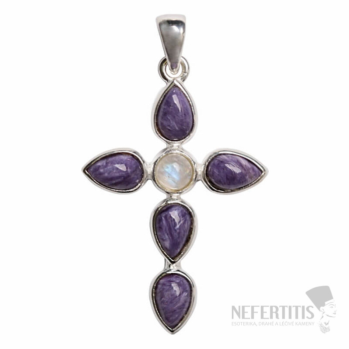 Beautiful designer silver pendant in the shape of a cross with charoite and moonstone . The beautifully purple-colored charoite will enchant you not only with its silky shine, but also with the transformation of the drawing in the changing light. Ag 925. You are purchasing the jewelry shown directly.