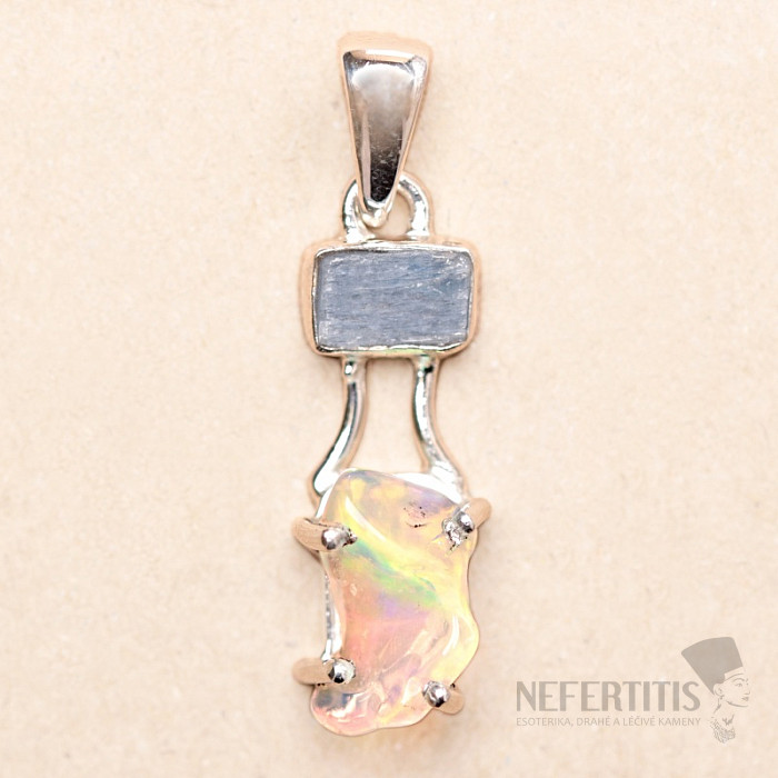 Elegant silver pendant made of raw, polished opal, with a beautiful play of colors, and blue kyanite crystal. Ag 925. Impressive and elegant jewelry, evoking joy and feelings of harmony from the look. Ethiopian opals… more »