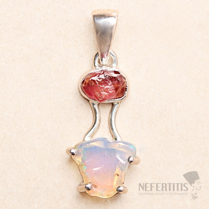 Elegant silver pendant made of raw, polished opal, with a beautiful play of colors, and raw pink tourmaline . Ag 925. Impressive and elegant jewelry, evoking joy and feelings of harmony from the look. Ethiopian opals… more »