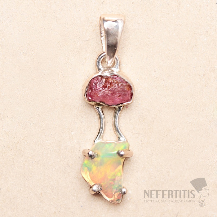 Elegant silver pendant made of raw, polished opal, with a beautiful play of colors, and raw pink tourmaline . Ag 925. Impressive and elegant jewelry, evoking joy and feelings of harmony from the look. Ethiopian opals… more »
