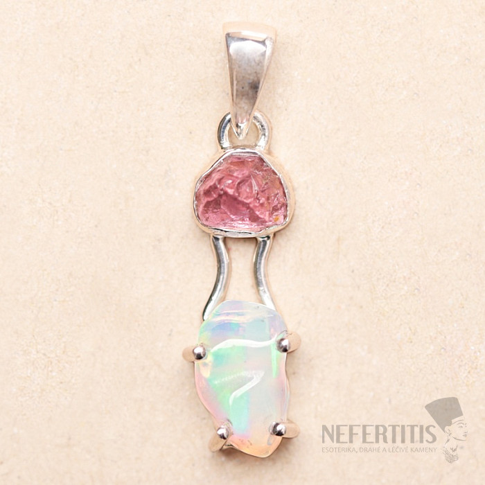 Elegant silver pendant made of raw, polished opal, with a beautiful play of colors, and raw pink tourmaline . Ag 925. Impressive and elegant jewelry, evoking joy and feelings of harmony from the look. Ethiopian opals, compared to Australian opals, literally luxuriate in neon-bright reflections of colors. Although they don't look like it at first glance, the fireworks of colors that burst from the opal in this pendant with every light hit will enchant not only you, but your entire surroundings. You are buying the jewelry pictured.