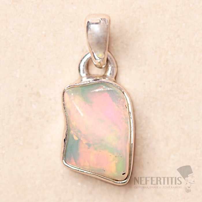 Elegant silver pendant made of raw, polished opal, with a beautiful play of colors. Ag 925. Impressive and elegant jewelry, evoking joy and feelings of harmony from the look. Ethiopian opals, compared to Australian… more »