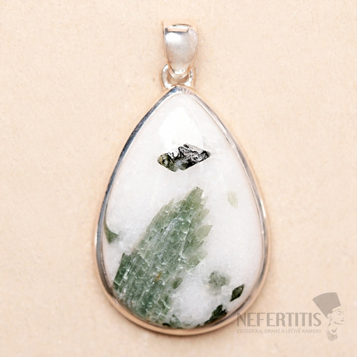 Unique pendant made of green tourmaline with quartz in silver , which suppresses stress, anger, fear and negativity. A charming piece of jewelry in which the delicate green color of verdelite tourmaline, which brings abundance and prosperity, is combined with the creamy white color of quartz, which highlights the beauty of tourmaline. Quartz has the same energetic properties as crystal, so it strengthens the effects of stones in its vicinity, it is a universal and powerful stone with healing energy. This pendant is particularly beautiful not only in its shape, but above all in its workmanship. Ag 925. You are buying the jewelry shown directly.