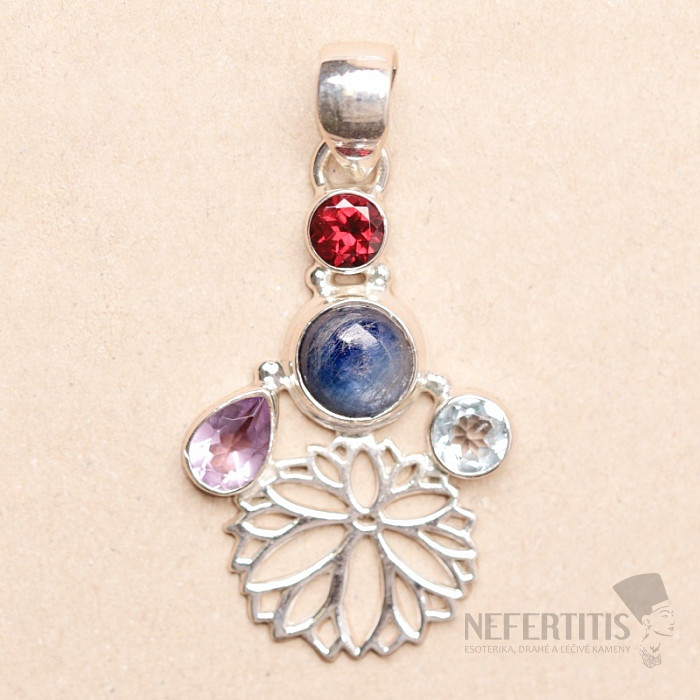 Beautiful silver pendant with a cabochon of beautifully colored kyanite and with broached amethyst, garnet and topaz. Ag 925. You are purchasing the jewelry pictured directly.