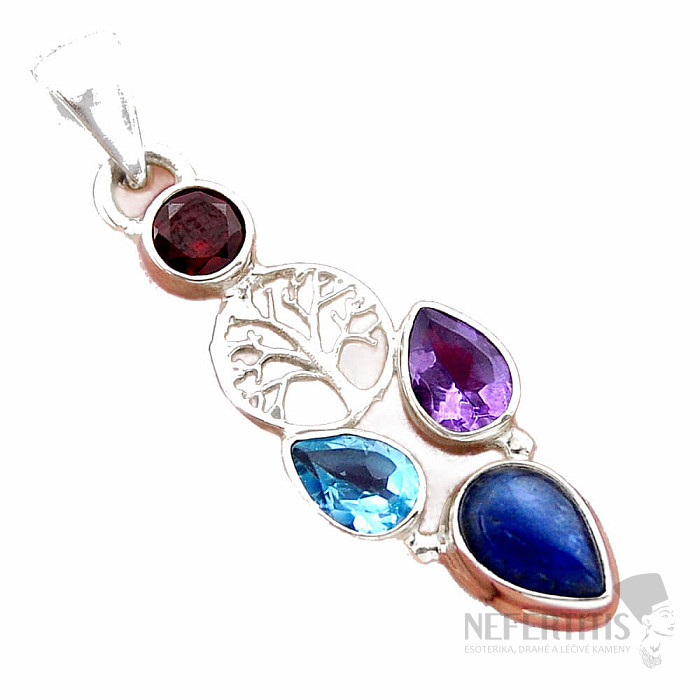 Beautiful silver pendant with a cabochon of beautifully colored kyanite, with broached amethyst and topaz. Ag 925. You are purchasing the jewelry pictured directly. Kyanite is considered a stone that brings peace and… more »