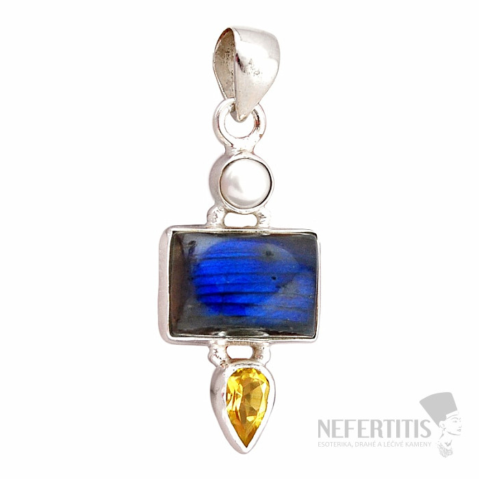 A captivating and exceptional silver pendant with first-class natural labradorite with a distinctive rainbow play of colors, in which the bright blue-gold color magically shines when the light hits it, with a white pearl and cut citrine. Ag 925. Let yourself be enchanted by the beauty and play of the bright blue color of labradorite. Thanks to the play of colors, this is an attractive and unmissable piece of jewelry. You are purchasing the jewelry shown directly.