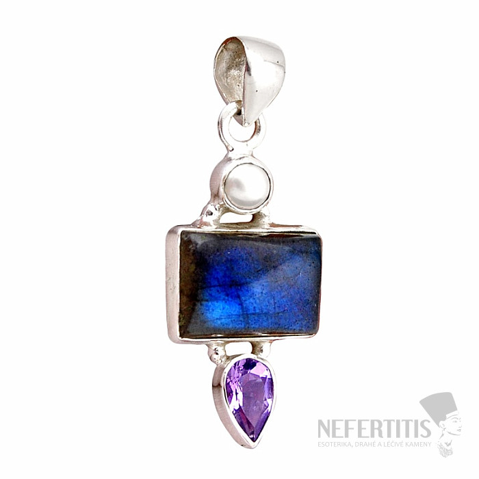 A captivating and exceptional silver pendant with first-class natural labradorite with a distinctive rainbow play of colors, in which the bright blue-gold color magically shines when the light hits it, with a white pearl and a cut amethyst. Ag 925. Let yourself be enchanted by the beauty and play of the bright blue color of labradorite. Thanks to the play of colors, this is an attractive and unmissable piece of jewelry. You are purchasing the jewelry shown directly.