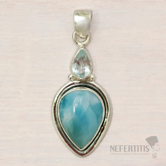 A charming pendant made of silver with a beautiful and high-quality cabochon of rare larimar, which resembles the play of sunlight on the surface of the sea, and cut blue topaz . The jewelry is handmade, the larimar is carefully selected with a distinct blue color. Ag 925. You are purchasing the jewelry pictured directly.