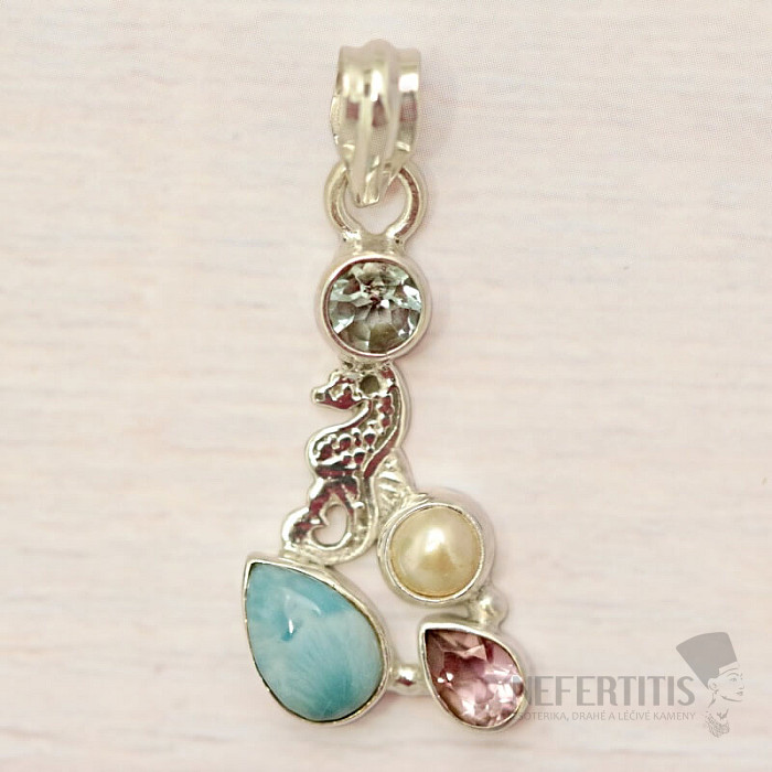 A charming pendant made of silver with a beautiful and high-quality cabochon of rare larimar, which resembles the play of sunlight on the surface of the sea, with cut topaz and amethyst, and a pearl. The jewelry is handmade, the larimar is carefully selected with a distinct blue color. Ag 925. You are purchasing the jewelry pictured directly.