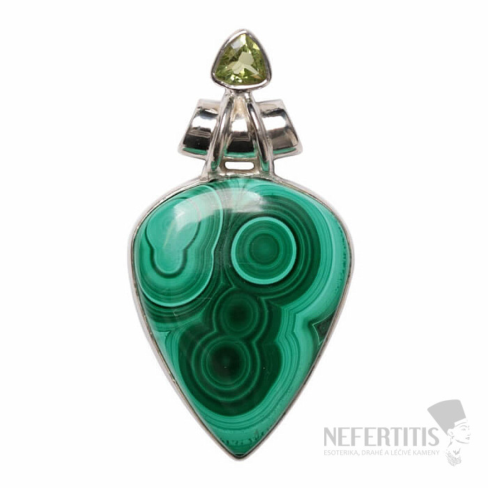 Silver pendant with malachite , which will enchant everyone with its deep green color and unique design, and cut olivine. Ag 925. You are purchasing the jewelry shown directly.