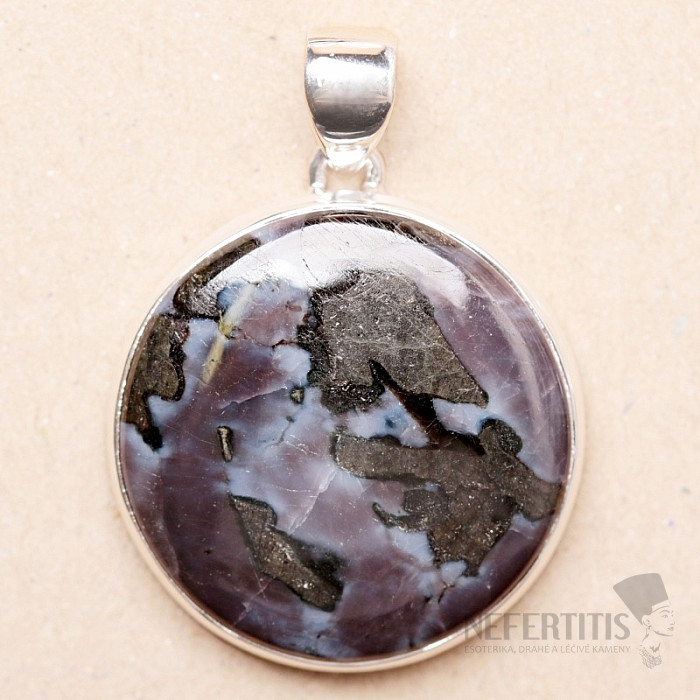 Elegant and distinctive pendant with black-silvery merlinite in silver. Ag 925. Merlinite is a commonly used name for dendritic psilomelane, it is characterized by two shades of black, which create very elegant… more »