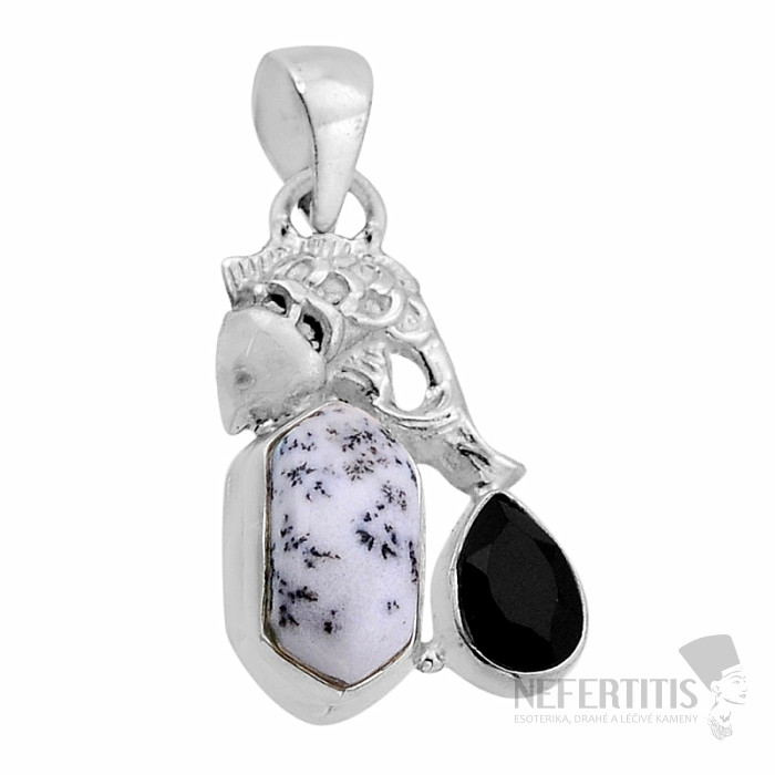 Charming silver pendant with dendritic opal , which with its white and gray color and beautiful pattern of inclusions evokes the image of a snowy landscape as if from the pen of ancient Chinese landscape painters, and cut onyx. Delicate and delicate, yet distinctive and attractive jewelry. An exceptionally beautiful stone that we rarely have in our offer. Ag 925. You are buying the jewelry shown directly.