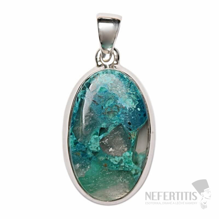 Charming silver pendant with rare and collector-valued natural Quantum quattro. Ag 925. Quantum quattro is a combination of four minerals - shattuckite, dioptase, malachite and chrysocolla. Each piece of jewelry is original, unique and thanks to the color combination and arrangement of minerals, it stimulates the imagination, reminiscent of a bird's eye view of the Earth. You will have a beautiful piece of jewelry that no one will miss, suitable for various occasions. You are buying the jewelry shown directly.