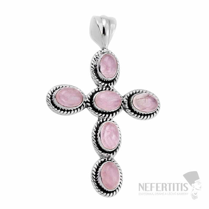Silver pendant in the shape of a cross with rose quartz cabochons. Ag 925. You are purchasing the jewelry shown directly. Pink is the color of new love, new romance, and new relationships. It promotes sensuality, can… more »