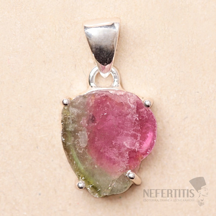 Silver pendant with a slice of rare watermelon tourmaline. Ag 925. Watermelon tourmaline is not as common as other types of tourmaline, which makes it a rare and collector's item. You are purchasing the exact piece of… more »