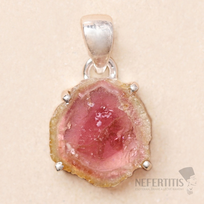 Silver pendant with a slice of rare watermelon tourmaline. Ag 925. Watermelon tourmaline is not as common as other types of tourmaline, which makes it a rare and collector's item. You are purchasing the exact piece of… more »