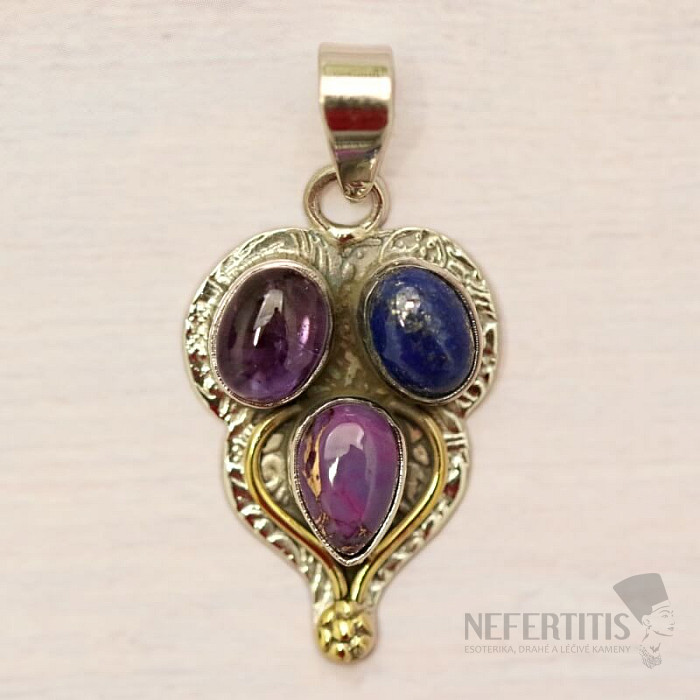 Exceptional silver, partially gold-plated, pendant with pieces of natural, dyed turquoise , connected with copper into an impressive cabochon of beautiful purple - violet color, with Lapis Lazuli and amethyst . This type of jewelry is gaining great popularity in the world due to the ever-increasing price of solid pieces of natural turquoise. Cabochons created in this way are one of the few options today to buy jewelry with natural turquoise at a relatively affordable price. Ag 925. You are buying the jewelry shown directly.