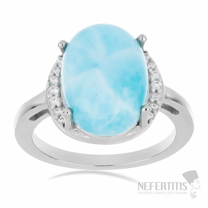 Larimar ring rhodium-plated silver with a beautiful and high-quality larimar cabochon from our Larimar Rhodium line . The ring is set with cubic zirconias for an unmistakable sparkling look. K amen larimar is carefully… more »