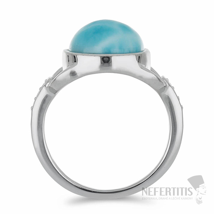 Larimar ring rhodium-plated silver with a beautiful and high-quality larimar cabochon from our Larimar Rhodium line . The ring is set with cubic zirconias for an unmistakable sparkling look. K amen larimar is carefully selected with a distinct blue coloring. Stone size approx. 1 cm. Ag 925.