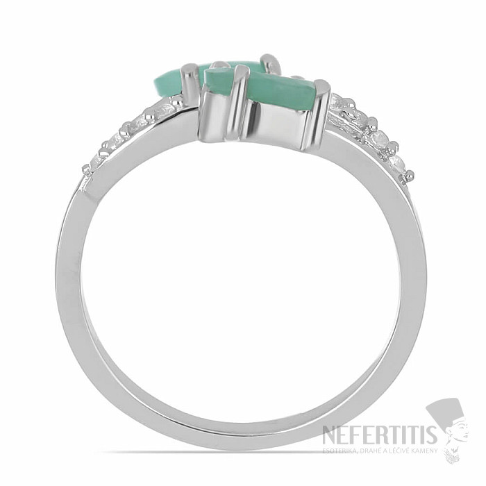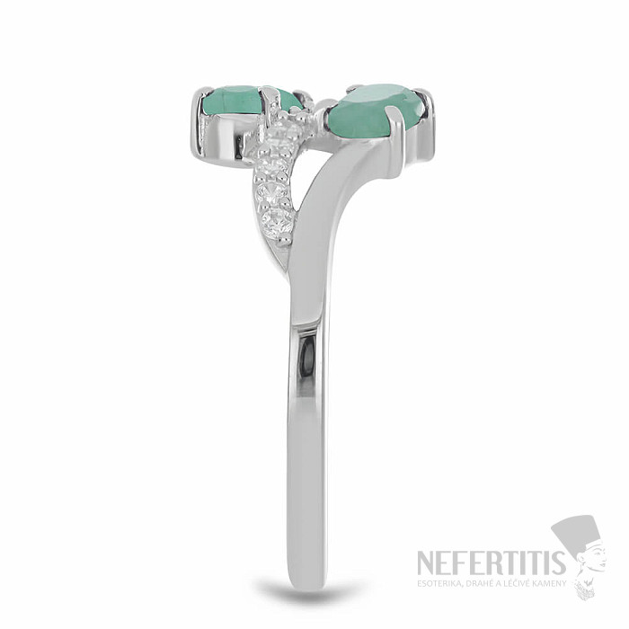 Silver ring from the designer line Nefertitis Collection with cut natural emerald and cubic zirconia. The stones are set in rhodium-plated silver, the surface of which resembles the appearance of white gold, giving the ring a luxurious impression. Rhodium-plated silver is less prone to oxidation (blackening) of the surface. A beautiful sparkling jewel with a clear stone of jeweller's quality, the beauty of which is emphasized by the impact of light on the individual surfaces of the cut, suitable for various occasions. Rhodium-plated silver Ag 925/1000. We deliver the jewelry in a standard paper gift box. Illustrative image.