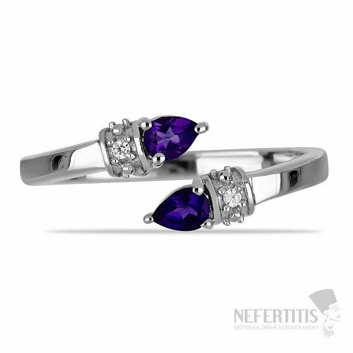 Exclusive silver ring from the Nefertitis Collection design line with deep purple cut amethyst. The amethyst is complemented by cubic zirconias for an unmistakable sparkling appearance. The stone is set in rhodium-plated silver , the surface of which resembles the appearance of white gold, giving the ring a luxurious impression. Rhodium-plated silver is less prone to oxidation (blackening) of the surface. A beautiful sparkling jewel with a clear stone of jeweller's quality, the beauty of which is emphasized by the impact of light on the individual surfaces of the cut, suitable for various occasions. Rhodium-plated silver Ag 925/1000. We deliver the jewelry in a standard paper gift box. Illustrative image.