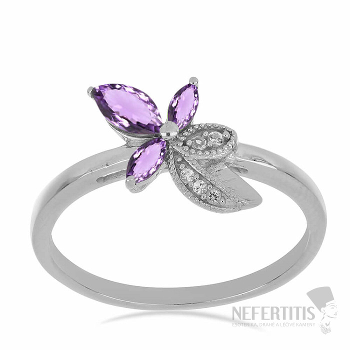 Exclusive silver ring from the Nefertitis Collection design line with deep purple cut African amethysts. Amethysts are complemented by cubic zirconias for an unmistakable sparkling appearance. The stones are set in rhodium-plated silver , the surface of which resembles the appearance of white gold, giving the ring a luxurious impression. Rhodium-plated silver is less prone to oxidation (blackening) of the surface. A beautiful sparkling jewel with a clear stone of jeweller's quality, the beauty of which is emphasized by the impact of light on the individual surfaces of the cut, suitable for various occasions. Rhodium-plated silver Ag 925/1000. We deliver the jewelry in a standard paper gift box. Illustrative image.