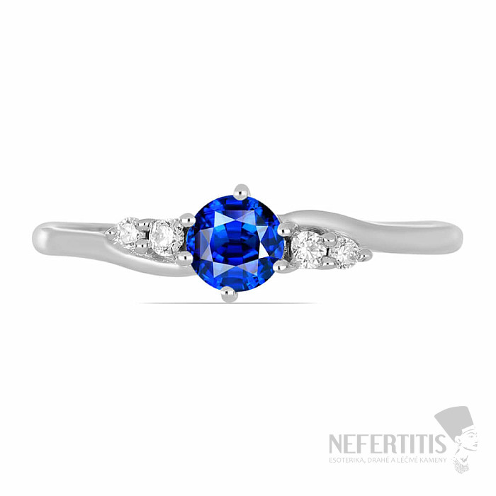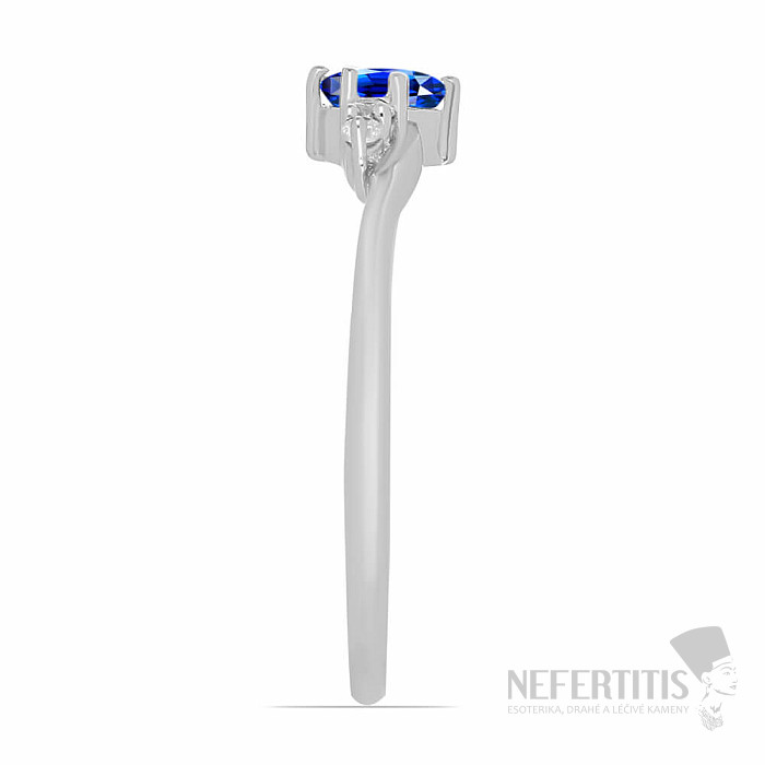 Exclusive silver ring from the Nefertitis Collection design line with a blue cut natural sapphire. The sapphire is complemented by cubic zirconia for an unmistakable sparkling look. The stone is set in rhodium-plated silver , the surface of which resembles the appearance of white gold, giving the pendant a luxurious impression. Rhodium-plated silver is less susceptible to oxidation (blackening) of the surface. Beautiful sparkling jewelry with a clear gem-quality stone, the beauty of which is emphasized by the impact of light on the individual facets of the cut, suitable for various occasions. Rhodium-plated silver Ag 925/1000. Sapphire size approx. 5 mm. Illustrative image.