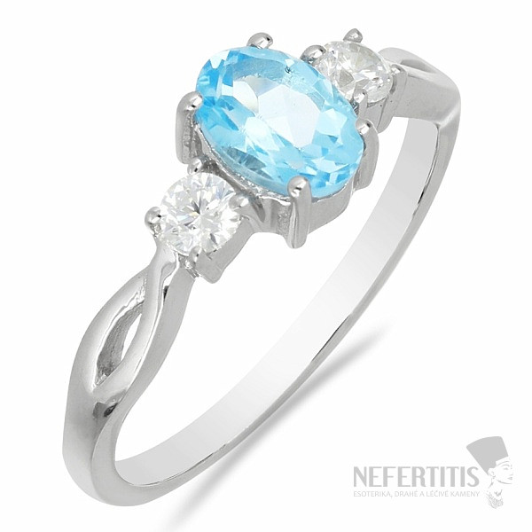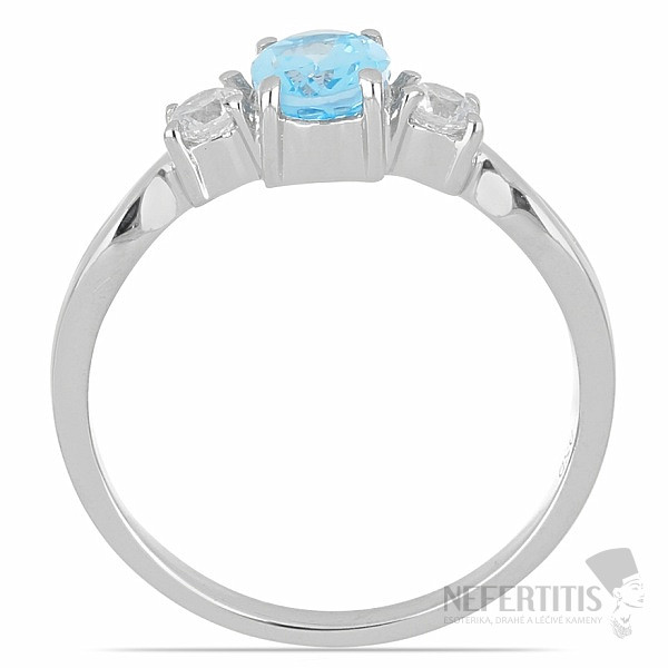 Exclusive silver ring from the Nefertitis Collection design line with blue cut natural Blue Sky topaz. Topaz is complemented by cubic zircons for an unmistakable shimmering look. The stone is set in rhodium-plated silver , the surface of which resembles the appearance of white gold, so the ring creates a luxurious impression. Rhodium-plated silver is less prone to surface oxidation (blackening). Beautiful glittering jewelry with a clear stone of jewelery quality, the beauty of which is emphasized by the impact of light on the individual surfaces of the cut, suitable for various occasions. Rhodium plated silver Ag 925/1000, topaz 0.8 carat. We deliver in a high-quality, attractive and elegant box in a combination of paper and suede with magnetic closure.